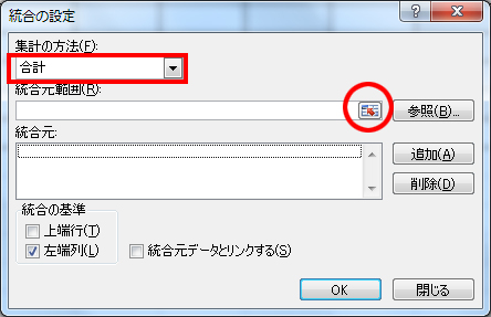 今回は異なる表の合算を求めるので、[集計の方法]を[合計]にします。