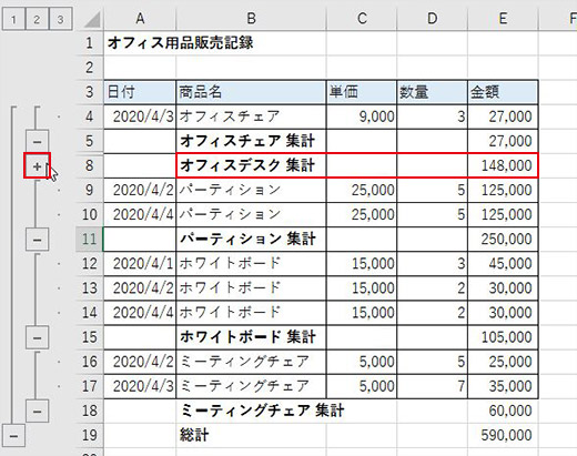 表の左側のマイナスボタンを押すと、詳細が非表示になり小計のみ表示されます。