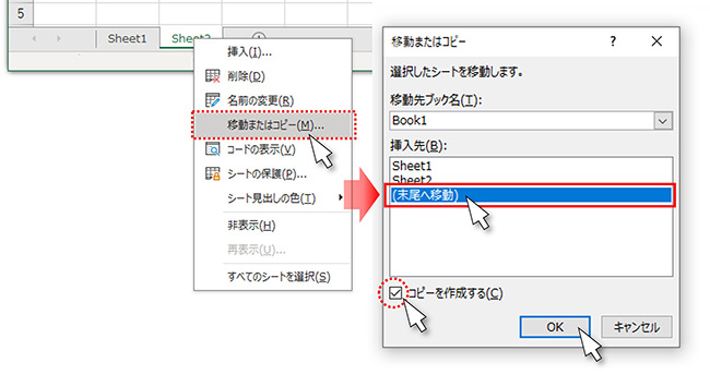 シートを複製したい場合は、(1)複製する元のシート(ここではSheet2)のタブを右クリック、(2)メニューから「移動