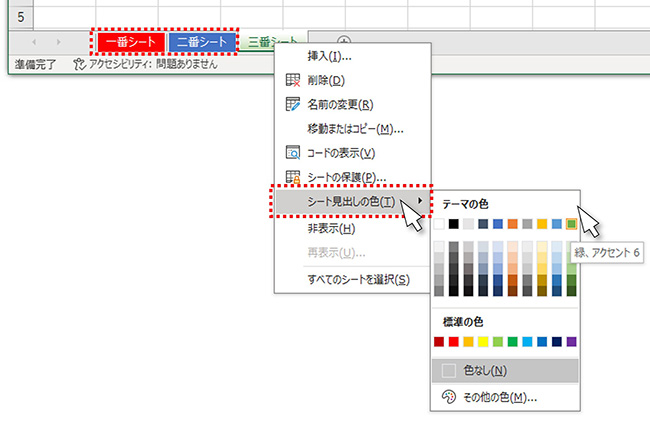 シートの見出し(タブ)に色付けをするには、(1)シートタブの上を右クリック、(2)メニューから「シート見出しの色」をクリックすると好きな色を選択できる状態になります。この例では「一番シート」「二番シート」それぞれに色付けしています。
