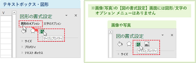 画面右側に「図形の書式設定」が表示されますので、「図形のオプション」を選択し、その下にあるイラストメニュー3つの中から、「サイズとプロパティ」をクリックします。