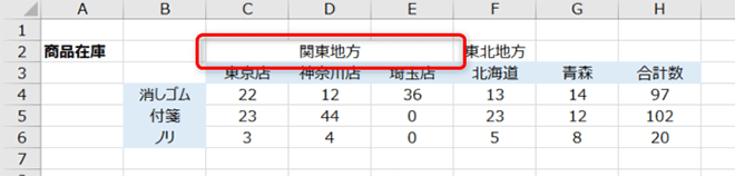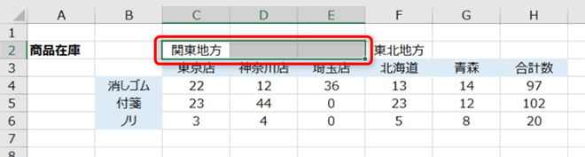 あなたはExcelで店舗ごとの商品在庫を管理しており、店舗名の上に複数のセルにまたがるように地域名を表示させたいと考えています。