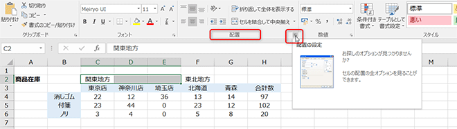 セルが選択された状態のまま、[配置]の項目の右下にある矢印マークをクリックします。