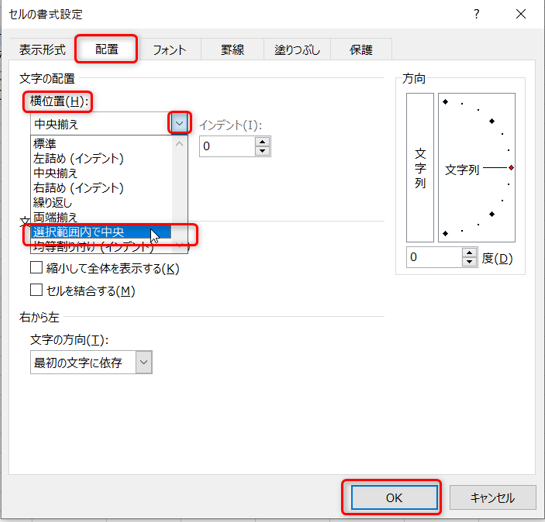 [配置]タブの[横位置]のプルダウンを展開し、[選択範囲内で中央]を選択した状態で、【OK】をクリックします。