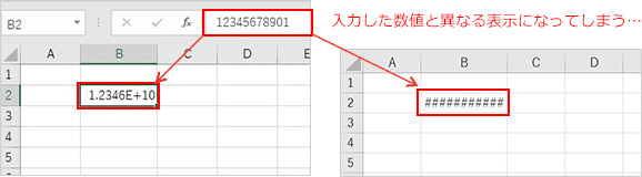 Excelで、セルの中に桁数の多い数値を入力すると、『1.2346E+10』や『######』など、不明な表記になってしまうことがあります。