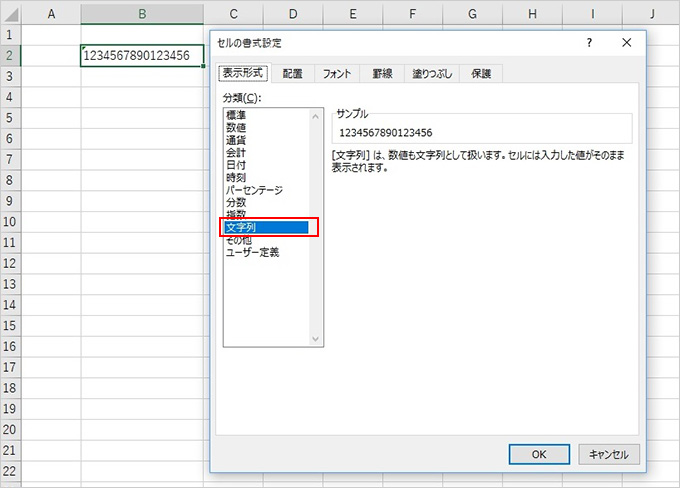 方法②と同様にセルの書式設定を開き、表示形式を [ 文字列 ] に変更します。
