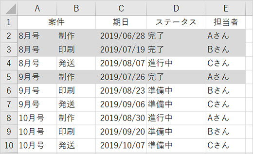 残っている作業をわかりやすくしたいのですが、いちいち行ごとに選択して色をつけるのは面倒ですよね。