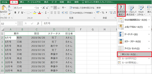対象範囲を選択して、ホームタブから「条件付き書式」をクリックし、「新しいルール」を選択します。