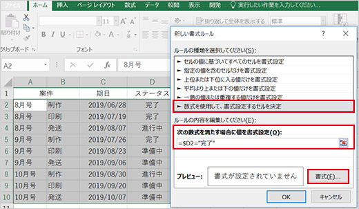 「数式を使用して、書式設定するセルを決定」を選択します。「次の書式を満たす場合に値を書式設定」の入力欄に「=$D2="完了"」と入力します。次に「書式ボタン」を押します。