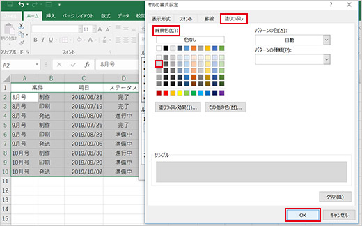 「塗りつぶし」タブを選択します。背景色から「グレー」を選択し、「OK」ボタンをクリックします。「新しい書式ルール」ウィンドウも「OK」ボタンで閉じます。