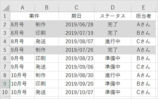 Excelで進捗表で管理している作業の完了項目を行ごとグレーアウトする方法をご紹介します。