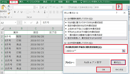 対象範囲を選択して、ホームタブから「条件付き書式」をクリックし、「新しいルール」を選択します。「次の書式を満たす場合に値を書式設定」の入力欄に「=$D2<>""」と入力します。「書式ボタン」から塗りつぶしの色を選択し、「OK」ボタンでウィンドウを閉じます。