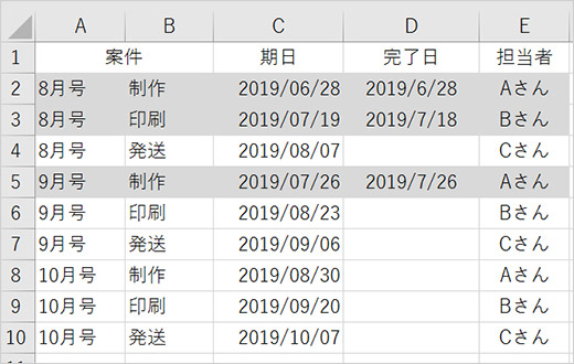 [ご参考]「完了日」欄に日付を入力すると行全体がグレーアウトする方法