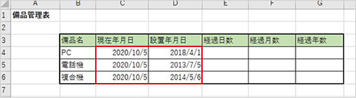 該当のセルに現在の年月日と、設置した年月日を入力します。