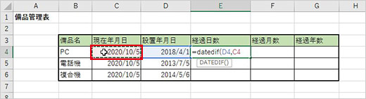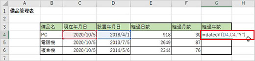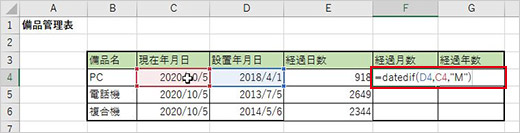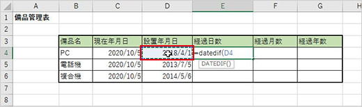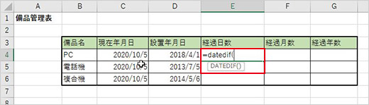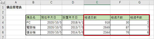 日数だけであれば、現在年月日から設置年月日を引き算すれば求めることはできますが、今回は月数・年数の表示と合わせてDATEDIF関数を利用します。