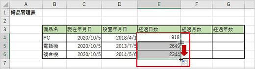 右下のフィルハンドルを下に引っ張り、他の備品にも経過日数を反映させます。