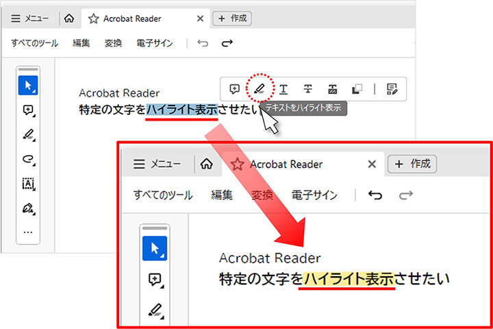 Adobe Acrobat Readerには、所定の文字部分にマーカーで線を引くような「テキストをハイライト表示」という便利なツールがあります。言葉や文を強調したい・注意しておきたい時に役立つ便利な機能をご紹介します。