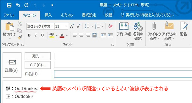 Outlookでメールを作成していると、英語のスペルが間違っているところに赤い波線が引かれます。必要ないので無効にしたいのですが、どうしたらいいですか?