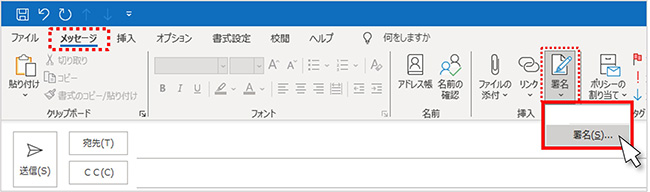 [メッセージ]メニュー、「挿入」グループから「署名」をクリック、プルダウンメニューから同じく「署名」クリックして選択します。