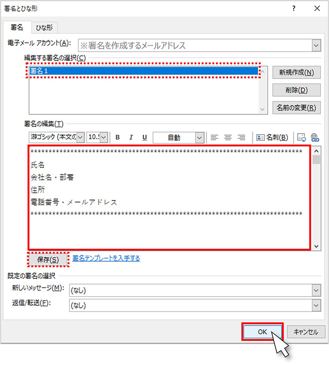「保存」ボタンで記入内容を保存し、最後に「OK」ボタンをクリックすると署名作成は完了です。