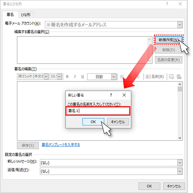 [署名とひな形]ウィンドウの「新規作成」ボタンをクリックし、「新しい署名」ダイアログボックスに作る署名の名前を入力します。