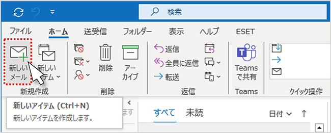 新規作成「新しいメール」をクリックして新しいアイテムを開きます。