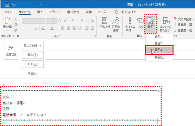 新規メール作成画面の[メッセージ]メニュー、「挿入」グループから「署名」をクリックすると作成済の署名一覧が確認できます。