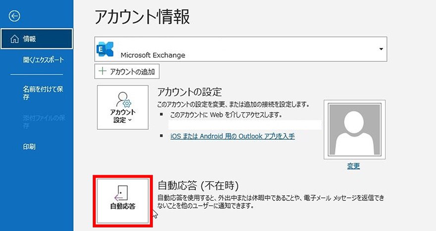Outlookを起動し、画面左上の「ファイル」をクリックして表示されるアカウント情報の中から[自動応答(不在時)]をクリックします。