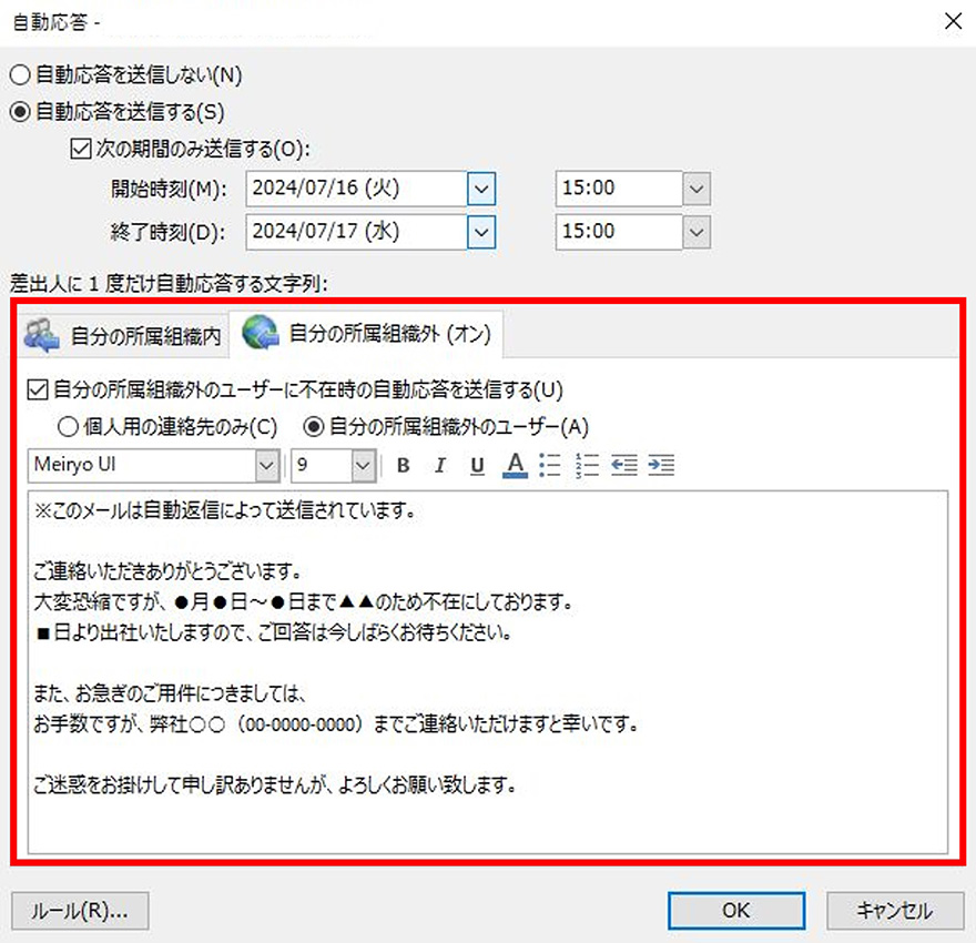 自動応答画面にある[自分の所属組織外(オン)]タブの[自分の所属組織外のユーザーに不在時の自動応答を送信する]のチェックを入れ(下記画像での返信対象は「自分の所属組織外ユーザー」を選択)、送信メッセージを入力し、「OK」をクリックしたら設定完了です。