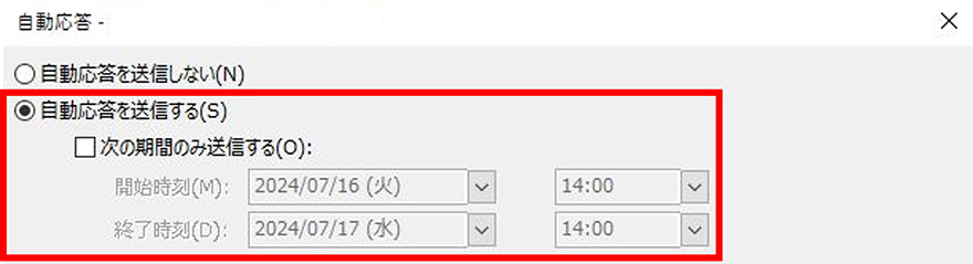 表示された「自動応答」画面の[自動応答を送信する]にチェックを入れ、[次の期間のみ送信する]にチェックを入れ、自動返信する期間を指定します。