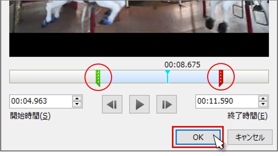動画の開始部分から終了部分まで、再生時間を設定できましたら、OKボタンをクリックして終了します。