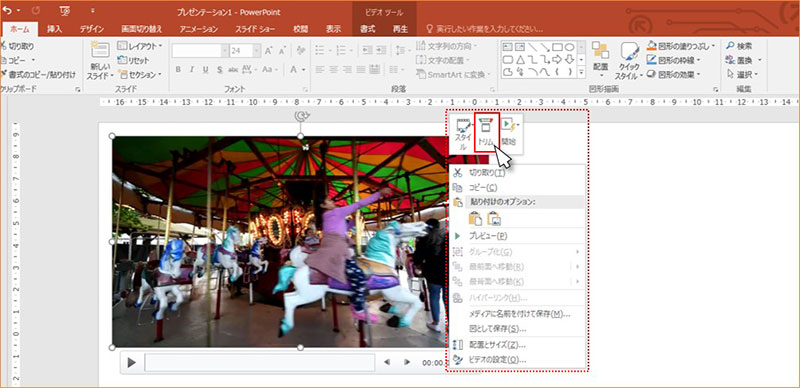 PowerPointに貼り付けた動画を右クリックし、上部に表示されたメニューから「トリム」をクリックします。