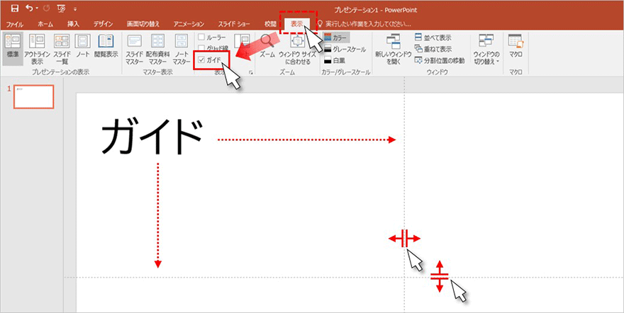 ガイドとは、作業ウィンドウの上下左右の中央部分に引かれる点線です。ガイドを表示するには「表示」グループにある「ガイド」にチェックを入れます。この縦横のガイド線は、カーソルで上下左右にそれぞれ移動することができます。