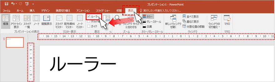 PowerPoint:ルーラーやグリッド線、ガイドを表示させる