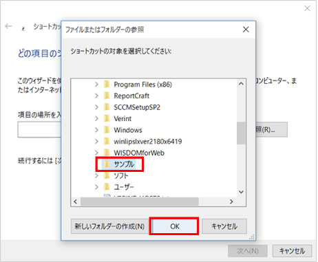 「ショートカットの作成」画面で「参照」をクリックし、任意のフォルダを選択してOKボタンをクリックします。(ここでは、「サンプル」という名前のフォルダを選択します。)
