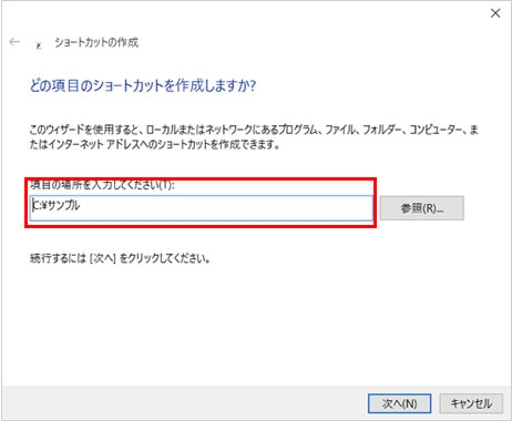「項目の場所を入力してください。」の入力欄に、「C:¥サンプル」と表示されたことを確認します。
