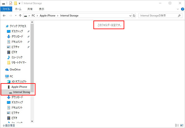 iPhoneで撮影した写真をPCに取り込んで保存、または印刷しようと、iPhoneとPCをケーブルで接続しましたが、写真が入っているはずのフォルダーが「このフォルダーは空です」と表示されてしまいます。