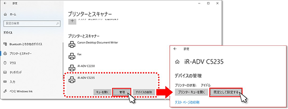 『設定』画面から通常使用したいプリンターの部分をクリックし、表示されたボタンの中から「管理」をクリックします。次に表示される「プリンター:デバイスの管理」画面のボタン「規定として設定する」をクリックすることで、通常使うプリンターとして設定することができます。
