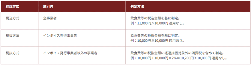 | 10,000 円超 | 接待飲食費 | 交際費等として扱い、損金不算入額の計算上一定の優遇措置がある。 |