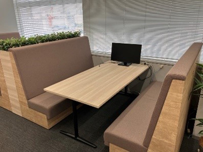 また、リフレッシュルームは、以前は一部屋に区切っていましたが、最近はオープンスペースで、執務スペースと融合しているものが好まれます。リフレッシュエリアでも仕事ができ、アイデアを出したいとき、カジュアルなコミュニケーションを取りたいとき等、必要に応じて働く場所を選択しています。