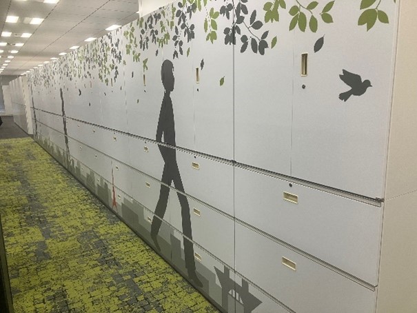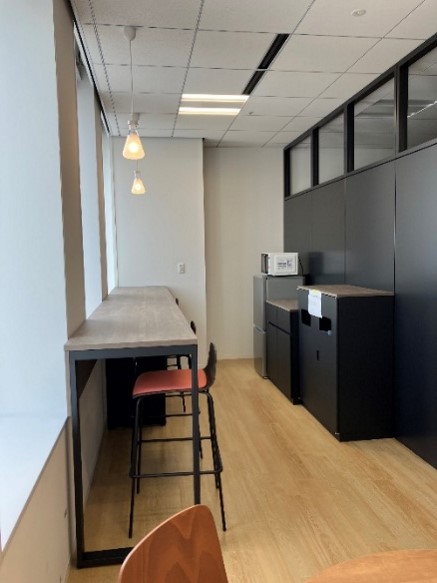 海老名営業所の執務スペースの床材はカーペットですが、リフレッシュエリアは塩ビタイルという、少し固い素材に変えています。