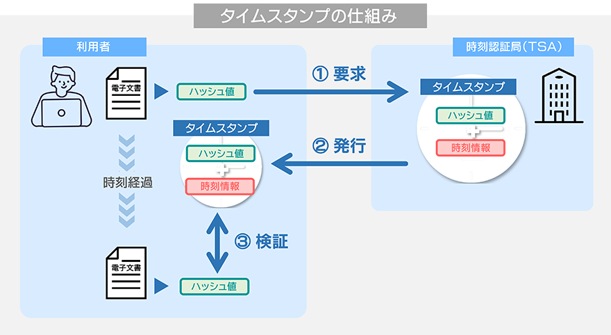 時刻認証局(TSA)は、このハッシュ値に時刻情報を偽造できないようにして結合したタイムスタンプを利用者に発行します。