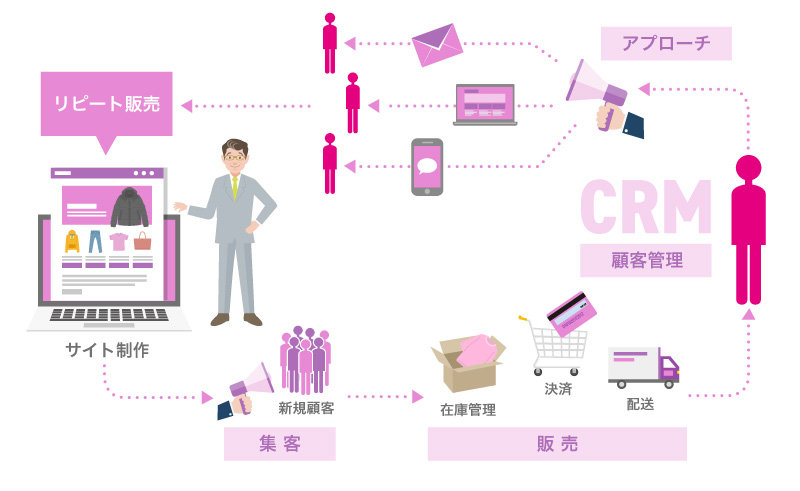 サイト制作 → 集客(新規顧客) → 販売(決済、在庫管理、配送) → 顧客管理(顧客分析 CRM) → 販売(リピート販売)