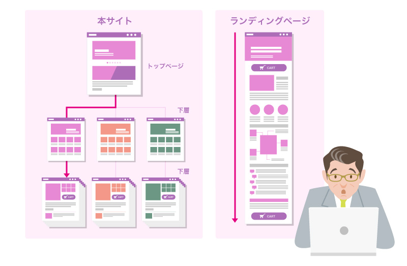 よく1つの製品やサービスのことを繰り返しおすすめしてくる縦に長いサイトがあるけど、あれをランディングページっていうのね。リアルなお店に例えると、自由に店内を歩き回ってもらうのが本サイトで、1人の店員が付いて接客するのがランディングページ・・・んー、なんか少しわかってきたぞ。両方の役割を1つのサイトで兼用できることもあるけど、それぞれの役割のちがいを認識した上で活用する必要があるんだって。よし、これも頭に入れておかないとだな。