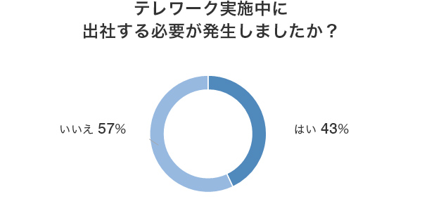 一般社団法人日本CFO協会がおこなった、企業のCFOおよび経理・財務幹部へのアンケート「新型コロナウイルスによる経理財務業務への影響に関する調査」によると、テレワークを実施または推奨した企業は全体の約70%でした。一方で、このうち43%が「テレワーク実施中に出社する必要が発生した」との回答でした。