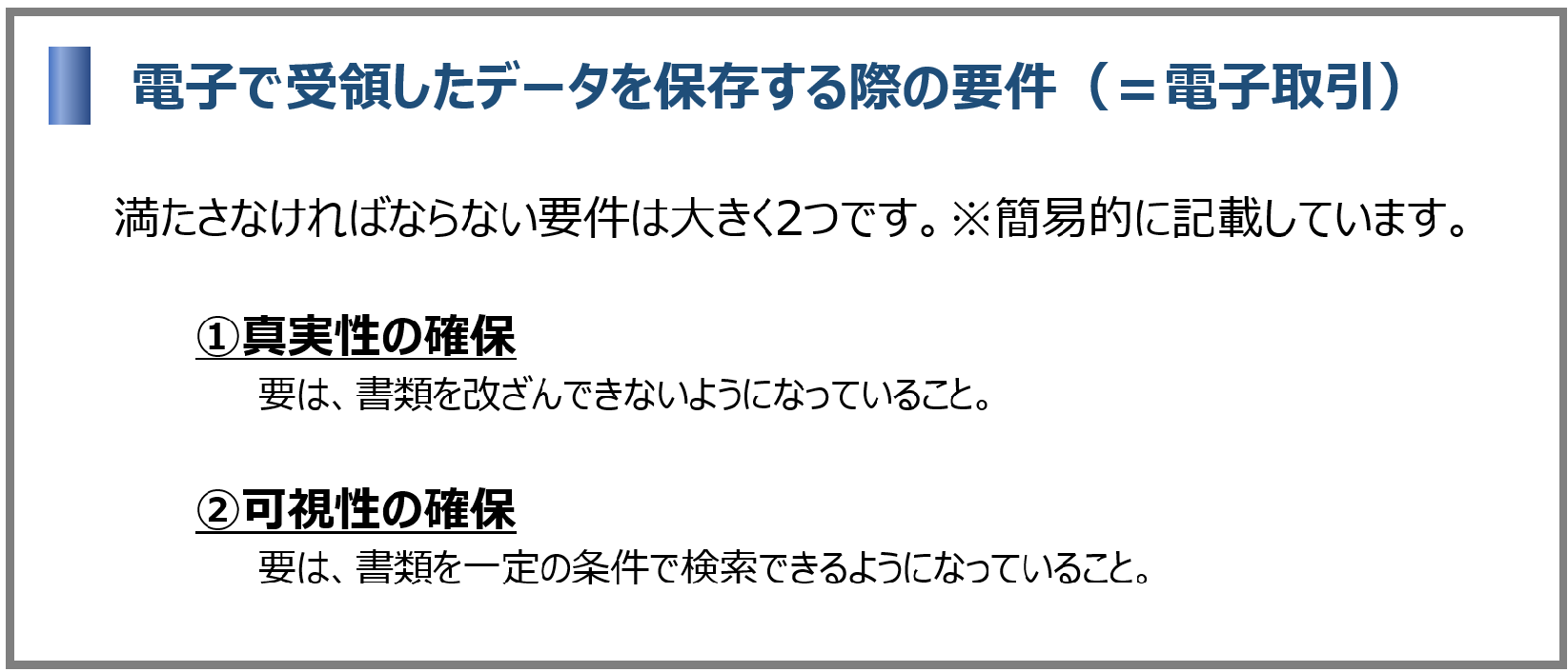 国税庁の資料では『真実性の確保』『可視性の確保』という言葉が用いられているため、難しい印象を受けるかもしれませんが、書類に改ざんが無いこと、訂正や削除を行った場合は、その履歴が確実に残るようにすること、税務調査等の場合には必要なデータをすぐに出せるようにすることの3つだと考えれば判りやすいでしょう。