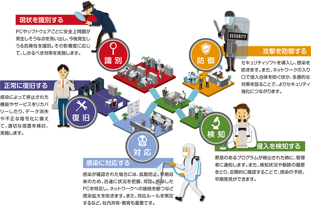 本記事ではセキュリティ対策5つの備え「識別」「防御」「検知」「対応」「復旧」のうち、