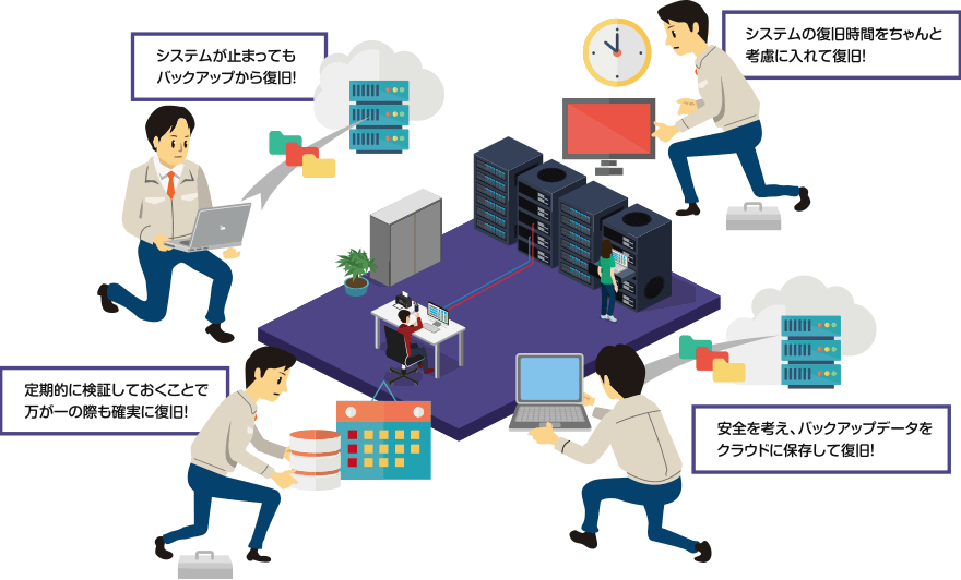 データの消失に備え、バックアップを定期的に行い、短時間に復旧できる仕組みを導入しましょう。