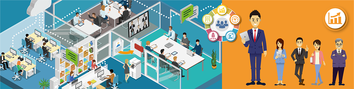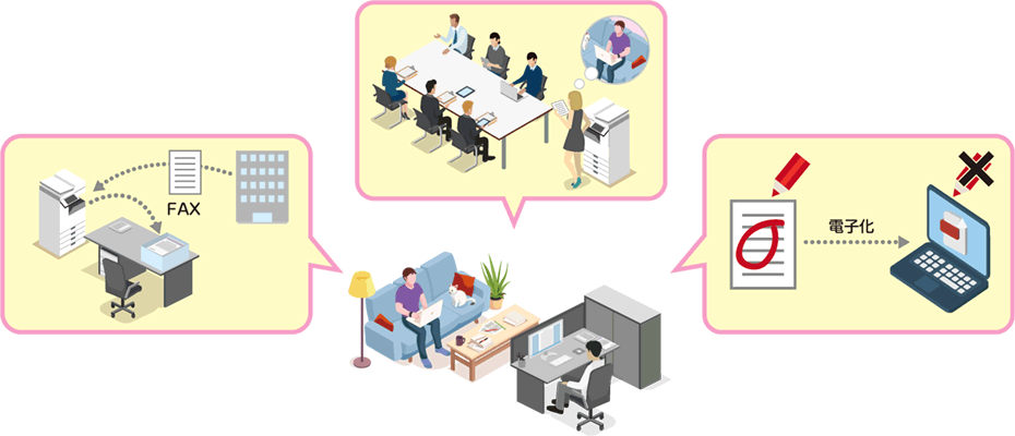 カメラやPC、プリンタなどのデバイスを整備することだけが、テレワークの準備ではありません。自宅でもオフィスと同じように違和感なく仕事ができる環境を用意するには、紙文書を前提としたこれまでの業務体制を大きく見直す必要があるのです。