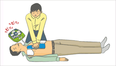 電気ショック後、直ちに胸骨圧迫から始め、できる方は30回の胸骨圧迫の後に、人工呼吸を2回行います。